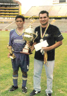 Luciendo el precioso trofeo y el cheque de mil dólares, el Ing. Aguirre posa con el goleador del torneo.